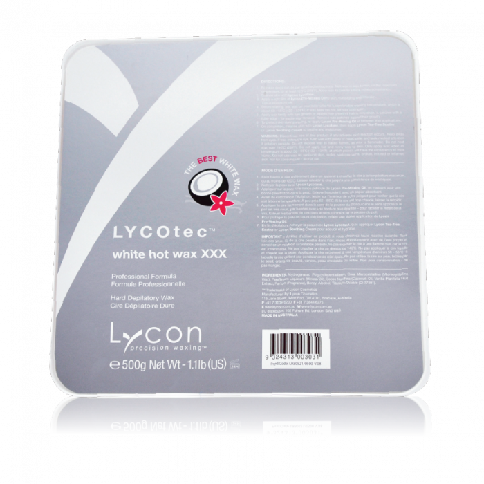 Délicieusement parfumée ! Cire VEGAN pour les peaux très sensibles et les clients allergiques ! Une formule de haute technologie avec une nouvelle génération de cire synthétique, du dioxyde de titane, super lisse, très élastique et qui ne se casse pas. Appliquée à très basse température. La cire chaude LYCOtec enlève sans effort les poils d’une longueur de 1 mm. Idéale pour l’épilation du visage, mais aussi pour les aisselles, le maillot et les grandes zones sans bandes. Les poils disparaissent à 100% pendant des semaines et la peau est parfaitement lisse et douce, sans barbe, ni démangeaisons, ni poils incarnés ! Les professionnels font confiance à LYCON pour obtenir des résultats complets et sans poils pour tous les types de pilosité !