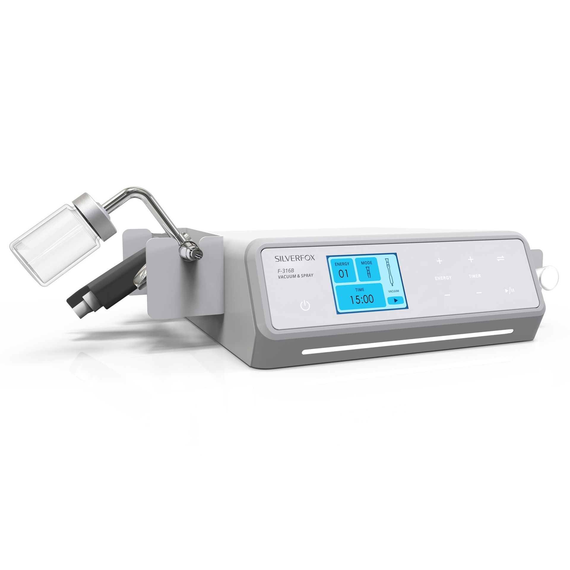 L’écran permet de sélectionner la pièce à main avec laquelle vous souhaitez effectuer le traitement et de régler la puissance d’aspiration ou de pulvérisation de l’appareil.
