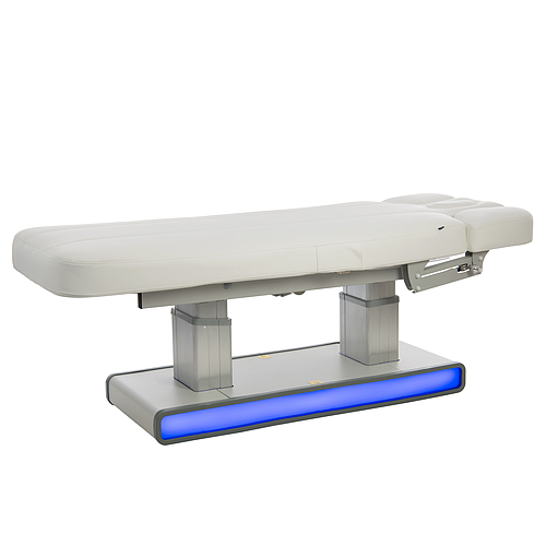 Table de SPA à 4 moteurs qui règlent la hauteur, linclinaison du dossier et du repose-pied et linclinaison de la table entière. Rembourrage de à haut confort avec revêtement en PU blanc de haute qualité. Matelas à 3 sections dune seule pièce avec chauffage intégré. Elle est équipée de repose-bras réglables et tête avec trou visage. Base avec système d’éclairage LED en couleurs interchangeables qui lui permet de s’adapter à chaque cabine.