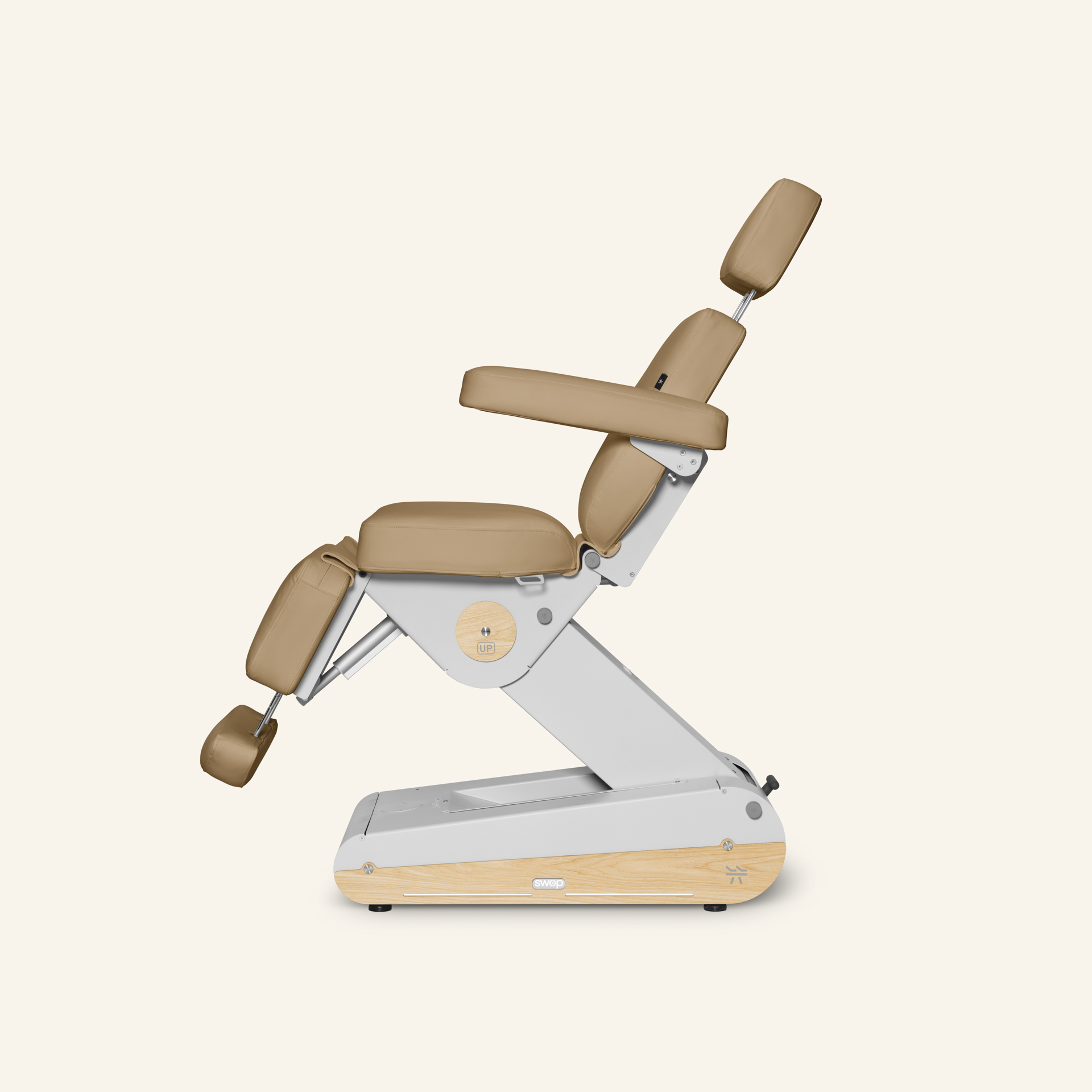 Ce fauteuil de traitement Swop est équipé d’un chauffage (réglable en 2 positions), d’une lumière LED blanche sur la base, de 3 positions de mémoire, d’une remise à zéro et d’un système à 4 roues pouvant être tournées à 360º et verrouillées et déverrouillées à l’aide d’un levier pour déplacer le fauteuil facilement et sans effort là où vous le souhaitez. La résistance à l’abrasion du cuir artificiel est de 400K et protège contre les bactéries et les rayons UV. Vous pouvez encore améliorer le fauteuil avec la lumière Cromo Mood Led. (différentes couleurs possibles) et d’un système audio en bambou (petit boîtier intégré dans le banc) qui vous permettra de diffuser de la musique relaxante pendant que vous dorlotez vos clients. Livré en standard avec des panneaux en bois clair.