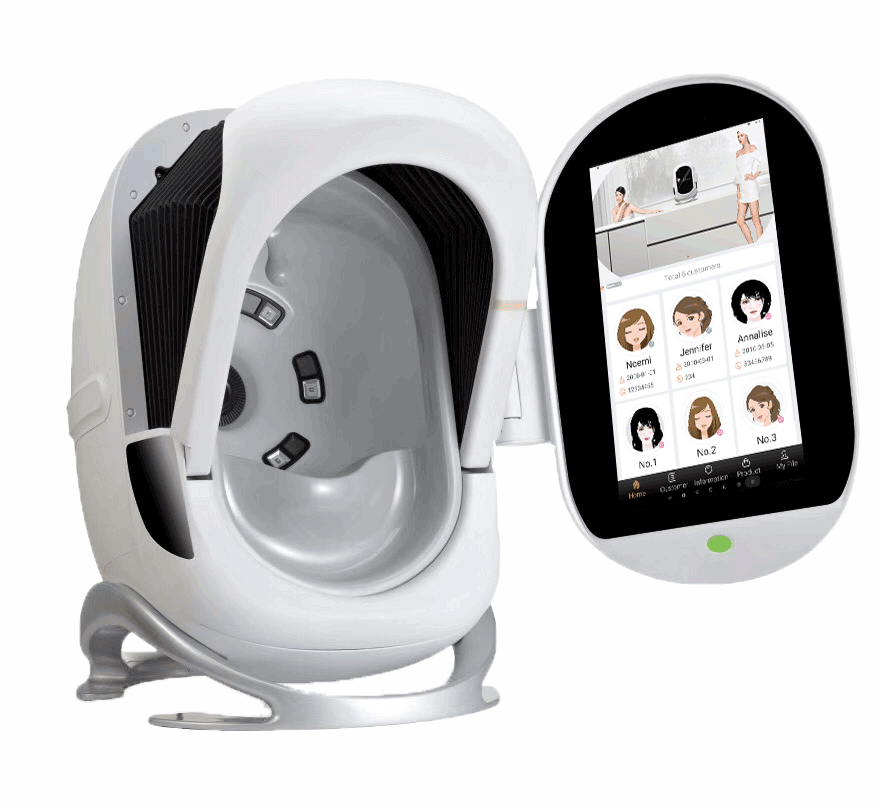 Le visage est photographié avec trois types d’éclairage (lumière RGB, lumière polarisée et lumière UV) dans la cabine faciale avec une caméra spéciale pour la peau. En quelques minutes, toutes les photos et mesures sont prêtes et le scan cutané complet est terminé.