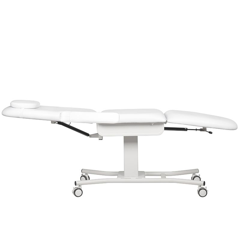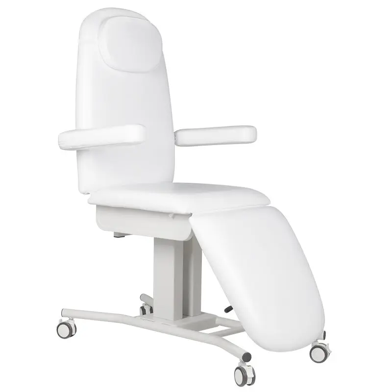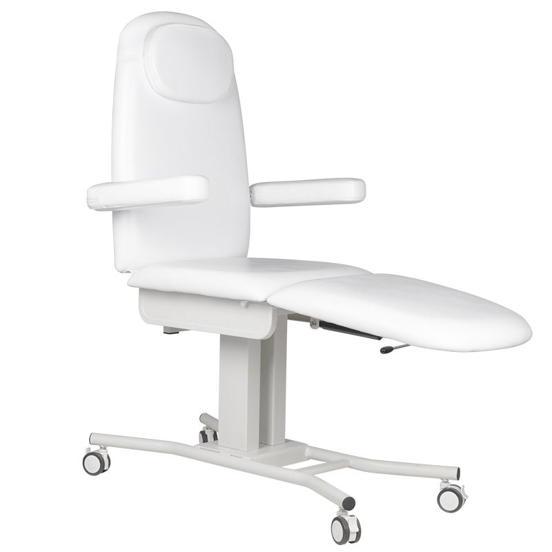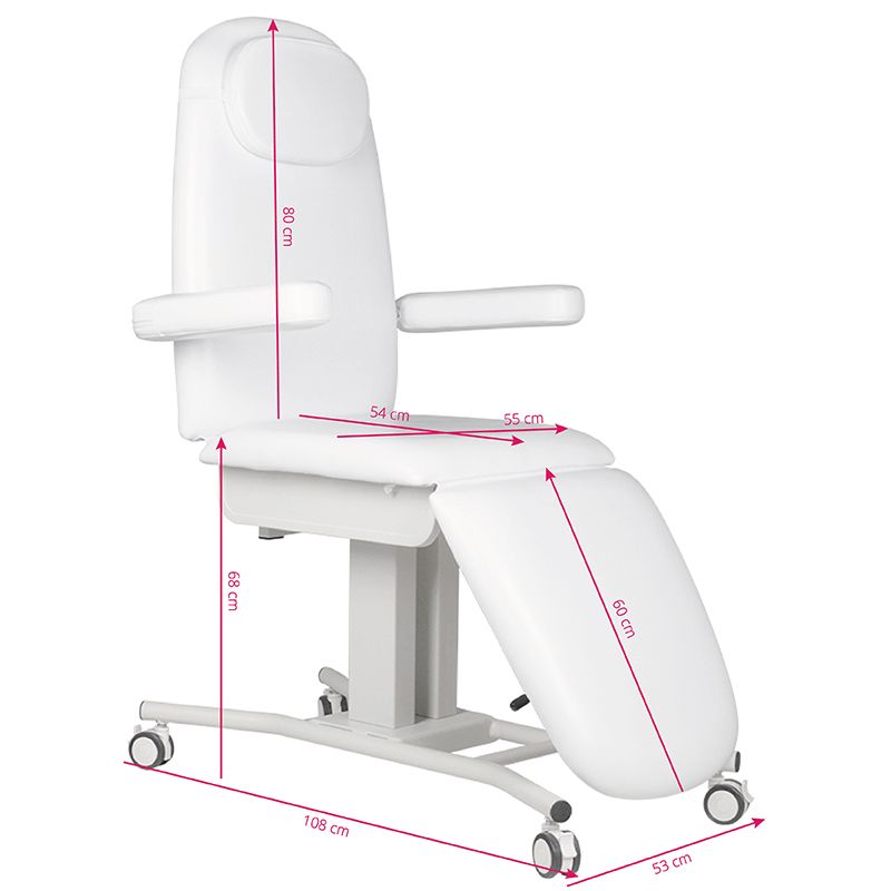 Voorzien van handmatig verstelbare rugleuning, voetsteun en armleuningen. De wielen zorgen voor een probleemloze beweging van de stoel. De bekleding van de stoel is gemakkelijk te reinigen en is gemaakt van eco-leer. De fauteuil is verkrijgbaar in de kleur wit.