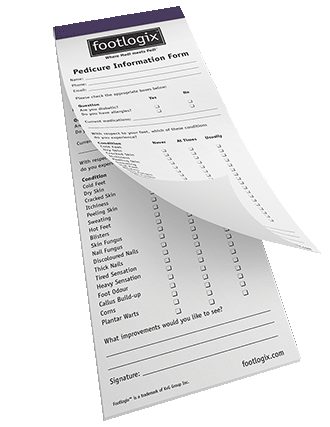 Een goed pedicureconsult verzamelt eerst alle kritische informatie die u nodig heeft om de juiste behandeling te geven. Of u nu persoonlijk, telefonisch of per e-mail advies geeft, het Footlogix® Pedicure Informatieformulier is de beste eerste stap in een grondige, professionele dialoog met uw cliënt. Naast het helpen, levert u de perfecte service, dit formulier biedt een geweldig historisch referentiepunt voor het volgen van verbeteringen in de loop van de tijd.