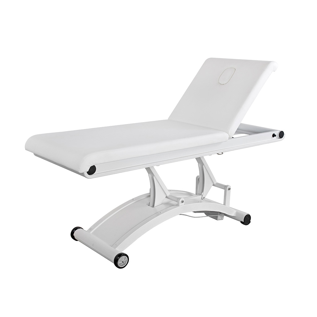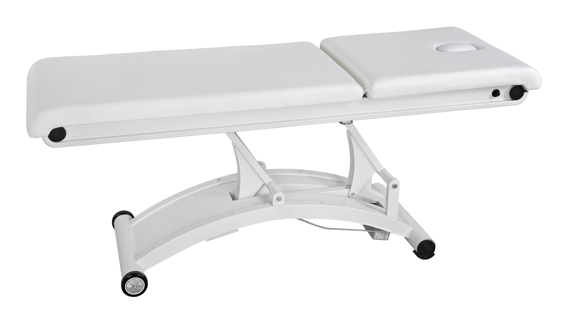 Minimalistische 2-delige massagebank, verstelbaar in hoogte door middel van 1 motor, de rugsteun is verstelbaar mbv een gasveer. Neusgat. Stevig metalen frame met achteraan 2 wielen voor het makkelijk verplaatsen.