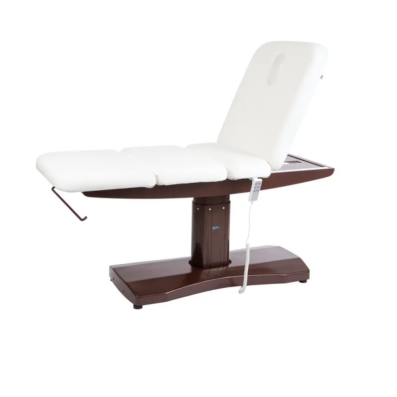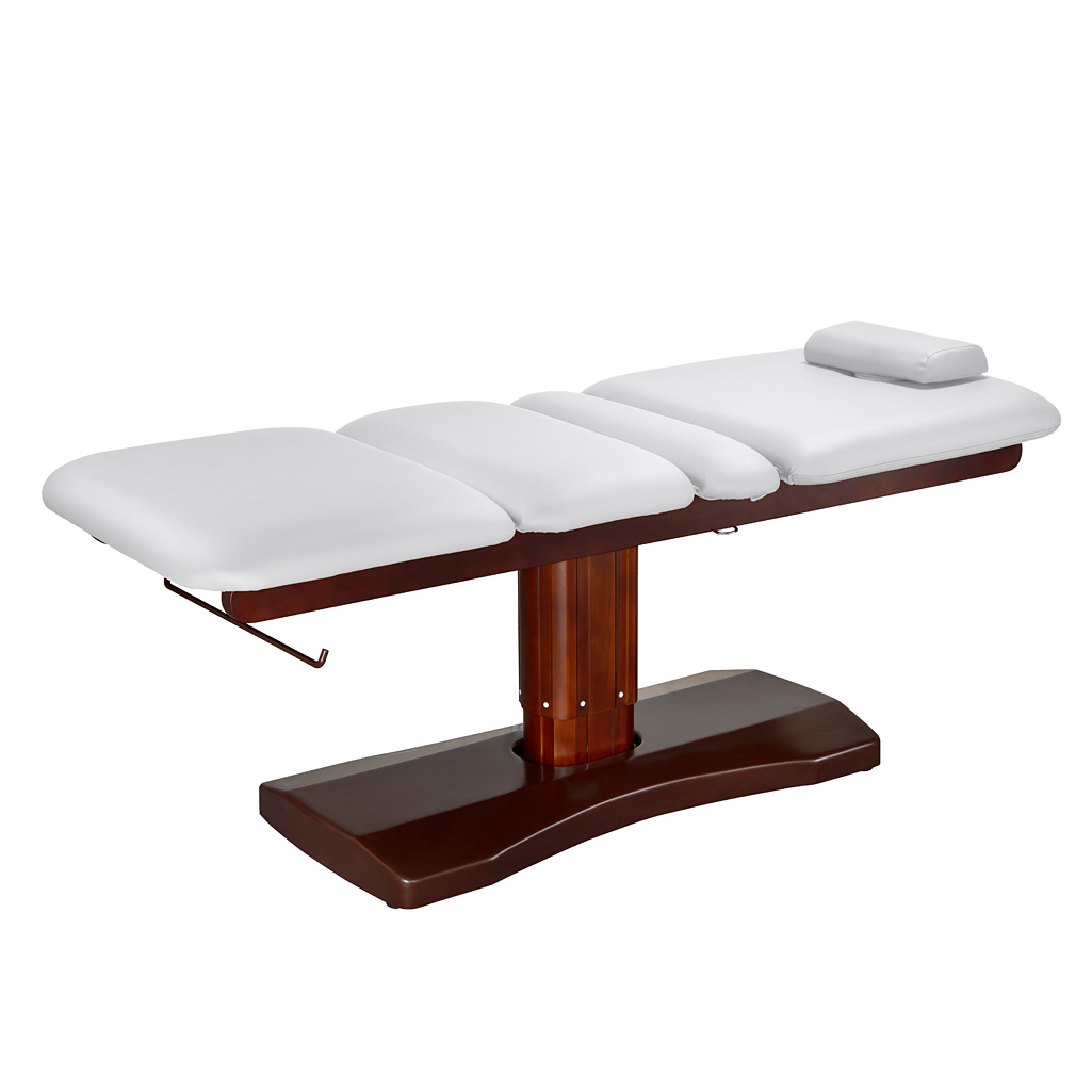 Hoogwaardig, multifunctioneel en multisectoraal massagebed. Uitgerust met 3 motoren dewelke hoogte, rugdeel en het centrale gedeelte bedienen. Hoofdsteun met neusgat. Stevig metalen frame, overtrokken met aluminium en ABS in wengé kleur. Makkelijk te reinigen witte PU bekleding.
